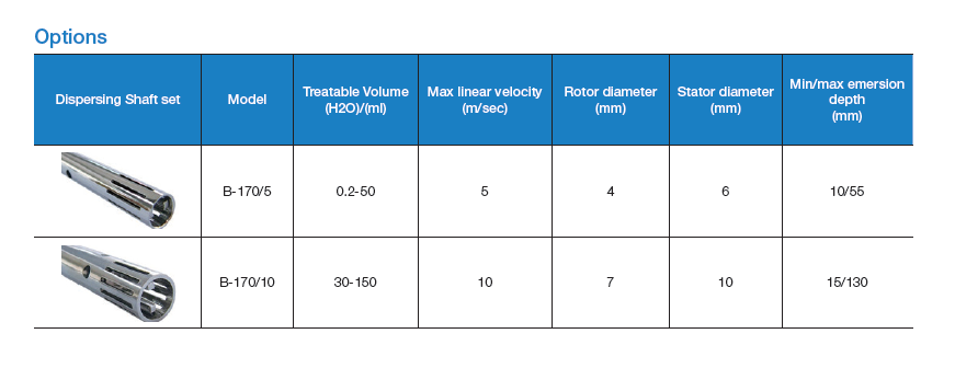 ● The B- 170 is a rotor/stator type hand held tissue homogenizer which can rapidly dispersing, homogenizing, extractions, cell disruption, mixing, emulsifying, suspending samples in 0.1 - 50 ml of liquid or 1-250ml depending on the dispersing shaft. During operation, the suspended material is drawn into the core of the homogenizer by a rotor turning at up to 30,000 rpm.The material is repeatedly cycled through narrow slits in the stator where it is rapidly sheared and disintegrated by high shear mechanical action. Complete homogenization oftissues (muscle, liver, breast tissue, etc.) is usually achieved in a few seconds. Little, if any, heat is produced during the process.